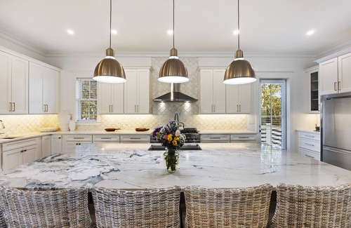 stepping inside the home, you'll discover a luxurious and contemporary design with a laid-back coastal vibe The open floor-plan of the main living space is an ideal setting for casual gatherings and spending time with friends and family. The gorgeous new kitchen boasts all new appliances and a magnificent central island that allows for plenty of entertaining and prep space. There are six stools at the island counter for easy meals and a larger dining table with seating for 10. Everyone will enjoy relaxing in the comfortable living room area with huge flat-screen TV and an abundance of windows that allow in the natural light.