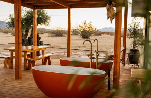 step into sundara’s outdoor sanctuary, a peaceful retreat nestled in the high desert landscape Enjoy sweeping panoramic views and soak in the tranquility beneath ancient olive trees. Unwind in the hot tub or one of two freestanding outdoor bathtubs, perfect for soaking under the stars. Challenge friends to a game on the private pickleball court, gather around the fire pit, or simply relax in a hammock while watching breathtaking sunsets and listening to the sounds of desert wildlife.