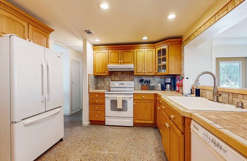 inside this oasis, you’ll feel right at home in the multiple, spacious living areas bursting with natural light, stylish decor, plush seating, and beautifully designed, warm interiors Kick back on the sofa for a movie marathon or break out the card games at the dining table. There’s even a desk space for those hoping to get a little work-from-home done vacation-style. A well-appointed kitchen boasts modern appliances, ample storage, and additional counter seating for effortless mealtimes. Craft hearty breakfasts or quick snacks with ease. Even better, dine alfresco on the well-furnished patio while taking in the tropical surroundings and ocean air. It’s the perfect spot to watch the sunset and savor a glass of wine after a magical day.