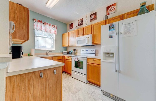step into this inviting two-story townhome, designed with families and vacationers in mind The first floor features an open-concept kitchen, a comfortable TV room, and laundry area for your convenience. From the patio, enjoy west-facing views of the lake and fountain, the perfect backdrop for Florida sunsets. A queen en-suite bedroom on this level provides privacy and comfort for guests.