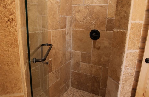 this is a single log cabin style room with a luxury bathroom included It has been recently remodeled with travertine floors throughout (no carpet). The room features a travertine bathroom and a kitchen with granite counter tops and custom hickory cabinets. It has handmade log beds.