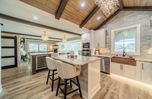 the fully equipped kitchen has high-end appliances, including a glass-door refrigerator, gas stove, and barn doors to the walk-in pantry There is seating for 7 at one of the two kitchen islands - one island features a wine fridge and ice maker. Make an adult beverage and keep the group's chef company while meals are being prepared.