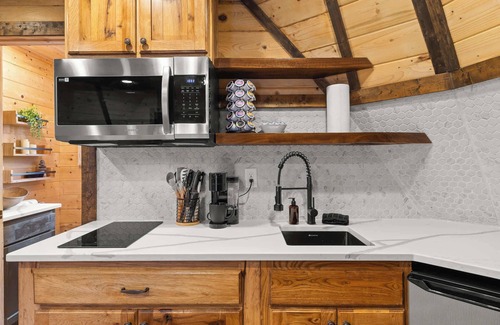 step into the charming teepee for a unique getaway that combines comfort with a sense of adventure The main level offers an open-concept living space that includes a kitchenette, living room, and a true queen bed for a restful night’s sleep. In the kitchenette, you will find a Keurig coffee maker, microwave, toaster oven, a hot plate, and other essentials. A cozy love seat provides a perfect spot for relaxation, and a bathroom with all the essentials is conveniently located on this level.