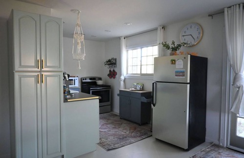 this is a very unique cottage for a couple looking for lots of space It is two stories with very open concept on both floors. The upstairs is a very expansive space that is complete open other than the full bath. The downstairs features a living/dinning area , as well as a sufficient kitchen area. There is also a large 1/2 bath on the ground floor. The upstairs is a very large space for couple to spread out. There is a King bed and two couches. It also features desk and office chair as well plenty storage for what attire you packed. There is a small remolded full bath upstairs as well.