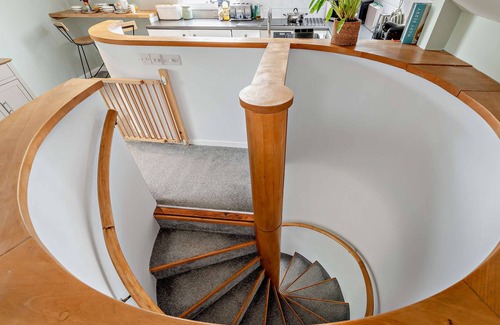 enter this reverse-level house on the ground floor where you will find two bedrooms: a twin zip-and-link (which can be made into a super-king on request), and a king-size bed with patio doors out into the pretty garden – perfect for enjoying a morning cup of tea in the fresh air The family bathroom is also located on the ground floor, as is the utility cupboard. The washing machine is in the integral garage. Head up the curved staircase to the open-plan lounge/kitchen/diner which is a light and airy space and a lovely area for relaxing after a busy day. A comfortable corner sofa is the ideal place to curl up with a good book or catch up on your favourite programmes on the Smart TV. Why not gather the family together at the dining table with seating for an evening of after-dinner board games? The kitchen is well equipped with all that you will need for delicious family meals and there is a handy breakfast bar from which you can enjoy magnificent views of Chilham Castle parklands.