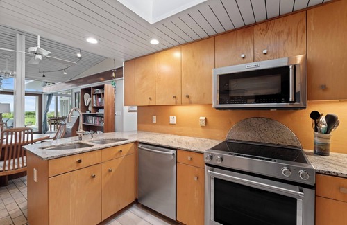 the beach suite has approx 1100 square feet of living space with an open-concept floor plan, with living room, dining area, and wood burning fireplace. The living room is furnished with a 3-seated leather couch and classic teak furniture and teak dining table that can sit up to 8. The living room offers an additional murphy bed for extra sleeping space. The oceanfront bedroom has a queen bed and a pocket door to separate it from the rest of the living space. The master bath was totally remodeled and features a freestanding heated jet bathtub, separate shower, and separate toilet room. The second bedroom has a Murphy bed, love seat, kitchenette and full bath with tub/shower, and a separate entrance.