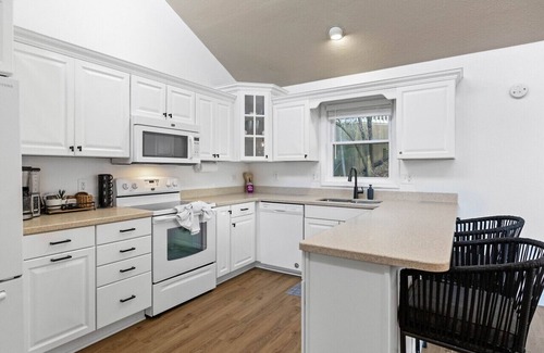the open concept kitchen is newly updated an features beautiful stone countertops, a breakfast bar with two barstools, a coffee station, and beautiful vaulted ceilings The kitchen is stocked with all the essentials you need to prepare meals. There is also a formal dining room table with seating 6.