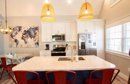 a welcoming covered porch leads you in to the captain, one of our spacious “key west style” cottages in boardwalk village When you walk in, you are greeted with an airy, fully furnished, open-concept living space that features a beautiful, well-equipped kitchen which has everything you need to make your meal preparations easy and enjoyable. There is also an over-sized island along with a dining area suitable for memorable meals and late-night card games! The living room is the perfect spot to put your feet up and relax after a long day on the lake. You can flip on the Smart TV, sign in to your streaming account and catch up on your favorite shows or movies. Cable & internet is provided. we have also provided you with a variety of games that will keep you entertained even on those rainy afternoons!