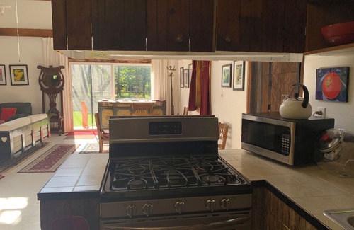the interior features a mix of antiques, stained glass, and cleverly handcrafted lighting fixtures and furniture The kitchen, well equipped and furnished for efficiency, meets a gourmet chef's skills. A vast library of board games, Books & CD's offers ''sunshine' on a rainy day. The space is an open design, yet cozy and intimate at the same time. It is best enjoyed by guests who enjoy each other’s company and want to spend time together. Please take note of the open stairs as well as the existence of heights without railings. There is a child gate available for the bottom of the stairs available on request.