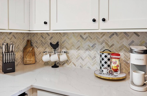 the recently renovated kitchen is fully equipped featuring a gas stove, microwave, toaster, dishwasher, keurig, spices, and plenty of kitchenware to make cooking a breeze