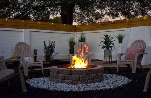 outside, enjoy the private patio with twinkling lights and a firepit, creating a cozy, magical atmosphere A grill is available for outdoor cooking. Please bring your own firewood and use the firepit safely.