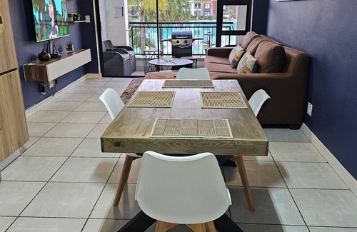 Our apartment is located inside a beautiful estate that is ideal for water lovers because of the beautiful Chrystal clear lagoon and 4 pools. Our apartment is right by the lagoon and the lagoon can be seen from lounge, balcony, and main bedroom. The estate offers great amenities such as spa, gym, restaurant, kids playground, carwash, laundromat, convenient store, a bar and many more..