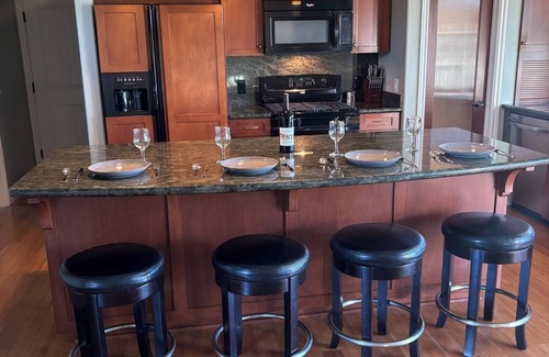 * the open floor plan is perfect for spending time together during all hours of the day The kitchen is fully equipped with new appliances, a butlers pantry, and an all granite central island with barstools. The living room includes a wood burning fireplace. All furniture is brand new and the modern interior design has recently been updated.