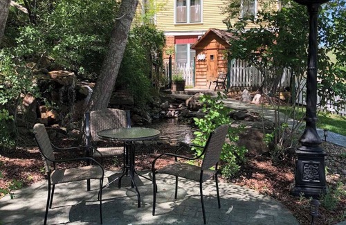 at your disposal we have a large property with private and shared outdoor spaces On the second floor down the inside stairs is a shared front balcony with table and chairs that provides a wonderful space to have your morning coffee and/or plan your day. Also on the third floor, right off your back master bedroom, you can go out your sliding glass door, to your private cedar deck with table and chairs, a propane heater and gas grill. If you follow the outside back stairs down to the gorgeous shared courtyard and you will come to an outside fire pit, the Redwood sauna, a man-made seasonal waterfall and nature pond that is home to our two turtles, Franklin and Sheldon. You will often times see them sunning on the rocks or swimming in the pond. There is a shared adjacent yard with a gas grill, two picnic tables, a children’s play set and a nice Redwood swing. It is a wonderful area for children to play in and has a nice view of the historic downtown area. There are 36 steps to get to your suite on the 3rd floor but there is outside temporary parking right off your back deck steps, totaling 9 steps. This is where you can unload luggage and/or pick up or drop people off.