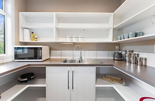 set across two spacious levels, the home enjoys views of lake taupo, mt tauhara, taupo and the mountains in the distance Upon entering the lower level, you'll find an internal access double garage with laundry facilities and a bedroom featuring a queen bed, set of single bunks and a kitchenette, perfect for extended family or extra guests.