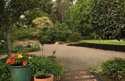 an expansive property with abundant birdlife, tuis, bellbirds, grey warblers, kereru and the smells of native new zealand bush all on a manicured property