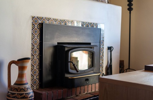 the interior embodies the southwest Saltia tiling, traditional viga beams, a hand-painted mural, and a large wood burning kiva fireplace are warm and inviting. High-speed internet, a streaming/casting compatible TV (Hulu, Netflix, Max, Disney+ subscriptions all included), keyless smart locks, espresso machine, full kitchen, private bathroom, and free parking are included.