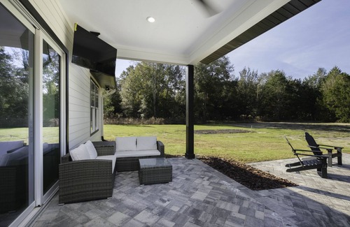 Stretch out and unwind at the spacious Rustic River Retreat! This home is brand new construction, designed with a unique style and only steps from the beautiful Ginnie Springs. The house features a huge fenced in yard with private gate, back patio, fire pit, grill and outdoor TV. There is a private master suite, and the oversized living room hosts plenty of seating. The open kitchen/dining/living with half bath and vaulted ceilings is the perfect setting for entertaining and social gatherings..