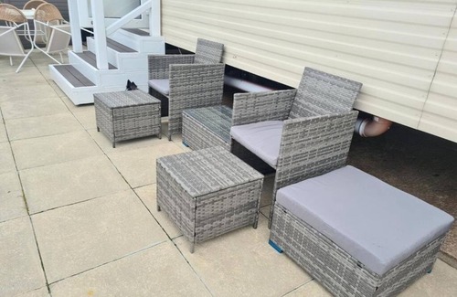 this inviting three-bedroom static caravan is thoughtfully designed for comfort, featuring a cosy fireplace, a modern bathroom, and a fully equipped kitchen with a dining area Stay connected with complimentary WiFi available throughout the property.