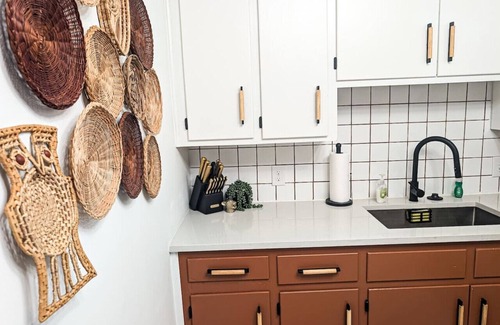 this updated 1960s apartment is spacious, light, and airy With a huge closet, full private balcony, and cozy king & queen beds, this space is perfect for a getaway of any length. With curated touches and color palette aligning with the tiki theme, this recently renovated apartment is quirky and fun. Original details, like the patterned breeze block, hardwood floors, brass and wood sliding doors were preserved to maintain the apartment's midcentury charm.