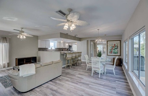 Seven beds nestled among manicured palm trees and mangroves, two minutes' walk to America's best beach. Tiki Bar lounge en suite. Fully remodeled luxury accommodations feature deluxe master suite, gourmet kitchen and three balcony decks for relaxing, party combination spa/pool, and lots of room and parking for our guests. Two washer/dryer sets (one up and one down); gas grill; beach cart with umbrellas, chairs, towels, and toys. Our minimum rental is 30+ nights; let us know about your scheduling needs..