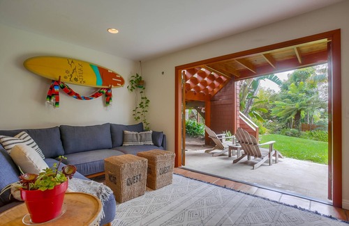 Separate gated entrance to the private guest suite which occupies the lower level of the home named the Treehouse of Love (no shared spaces). Enjoy the backyard to yourself! Brand new queen bed, cozy sofa, 65" TV, fridge/freezer, Keurig mini coffee machine, full bath with beautiful shower, and a patio set to enjoy the lush tropical backyard. Outdoor surf shower and a hammock to relax in. Close/walking distance to the ocean, park, and great local restaurants/bars..