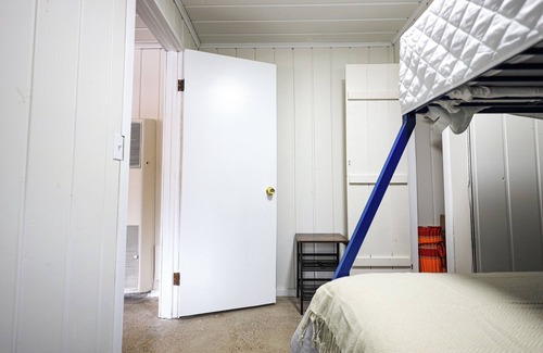 as a remodeled motel, the space is very cozy Queen beds were not common in the 50's but we squeezed one into the main bedroom. We've got a bunk bed that has a Full sized mattress on the bottom and a twin on top in room two. Our ARTICLE brand couch bed folds out for that extra guest or family member. the vintage has a full kitchen for you to cook in with meat's from walt's meats next door or warm up something quick before you head out to the beach!