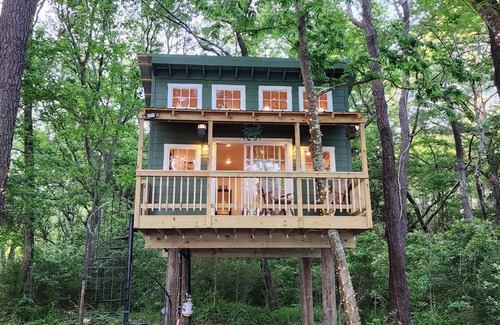 This is a 1 of a kind custom built tree house. It is specifically designed to help you escape the city and reconnect with nature! Features one full size queen bed in the loft as well as full size futon for extras guest. There is a full size shower and toilet with hot and cold running water. The kitchen features a microwave and mini fridge as well and basic dishware and cooking supplies. Outside, there is a lighted sitting area with a propane fire pit and picnic table. A short walk away there is our private dock featuring lounge chairs, a hammock, and a propane grill. Down on the shore line we have a small sandy beach area with 2 kayaks for Guest to explore beautiful Hungar's creek. Guests park a short distance away and will have full access to a golf cart to take them to and from the parking area..
