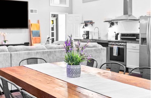 side a of the general store is a fully renovated 4 bed, 1 bath home with a spacious open-concept layout that once served as the town’s general store The oversized living and dining area features an 85" TV, large sectional, dining table and high-top bar table, providing plenty of space to relax and entertain.