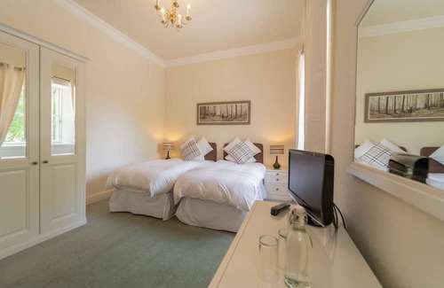 this spacious twin room, located on the first floor, boasts relaxing neutral decor, providing a delightful view of the tranquil woodland area at the back The space includes an entry hall, a family-sized ensuite bathroom equipped with a shower, and adaptable twin or double beds, complete with side tables and lamps. Additional amenities feature a spacious wardrobe, an armchair and a dressing table..
