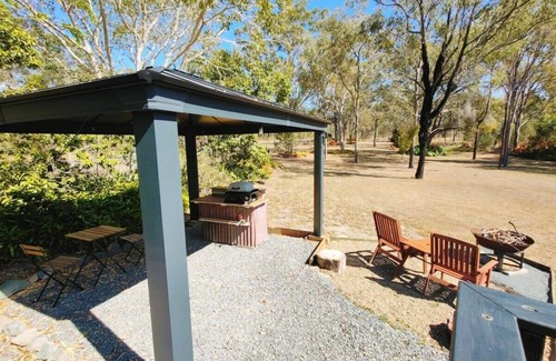 tiny ubuntu is set in a lovely garden and dam, complete with a bbq gazebo for cooking meals, a tailor-made art workshop, a campfire night to relax under the stars, and access to the herb garden Experience the allure of Baffle Creek close to the charming towns of Deepwater, Agnes Water, Seventeen Seventy, and an hour from the coastal town of Moore Park Beach.