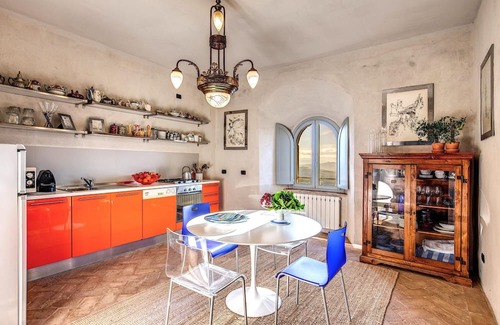 the tower's terrace perched at the top of five high floors - with elevator of course - is perfect for summer dining with a bird's eye view, cocktails or sunbathing when you chose a change from the pool The terrace crowns a collection of beautifully renovated and decorated suites and apartments, making a total of 6 bedrooms and 7 bathrooms, sleeping up to 12 people. Each room boasts historic and characteristic features, such as terracotta floorings, beamed ceilings, stone fireplaces, and ancient doors that has been combined so cleverly with a modern artistic furnishings that combines family antiques with modern and contemporary design pieces. The Torre offers an unforgettable and unique experience of living in a real medieval fortified castle in exclusivity.The castle interior with its high ceilings and soothing proportions, and artful while cheerful furnishings, provides guests with large and gracious areas to share both family, social and personal moments. Though rented as a an exclusive use property each floor offers a private hall with seating area, and bedrooms and bathrooms. In addition to the ground floor kitchen, there are two independent kitchens at the third and the fourth floor which can be used for breakfast, lunch and dinner. You can also enjoy your outdoor meals, on the magnificent 360° panoramic terrace (25 sq.mt.), or in the shade of the ancient trees of the park. The swimming pool, located in a sunlit and peaceful area between olive trees and rosemary, offers moments of pure pleasure in a truly Italian ambiance.