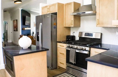 Newly remodeled quaint home just 9 miles south (10 minutes) from downtown Moab. This adorable home sleeps 6 people with 3 bedrooms and 2 bathrooms. Beautiful custom kitchen that is fully equipped to prepare and enjoy all your meals. Beautifully landscaped and partially fenced yard with mature shade trees and plenty of parking for all your outdoor machines, trucks and trailers. The house features a comfortable living room with fireplace, shuffleboard table and 58" smart TV. The dining area just off of the kitchen comfortably seats 6. The back patio area has a BBQ grill for nights you want to cook out. The main bedroom (bedroom #1) has an ensuite bathroom with double vanity, huge soaking tub and walk-in shower and king size bed. The bedroom also has a walk-in closet and smart TV. Bedrooms #2 & #3 have queen size beds, small dressers and closets. There are multiple places on the property to relax and take in views of the La Sal Mountains, the Moab Canyon Rim or unbelievable sunsets and stars. The house has been very comfortably and tastefully decorated with guests comfort in mind.