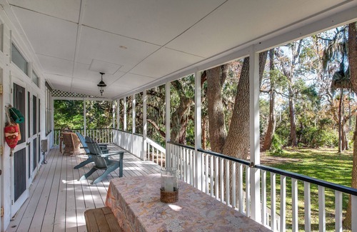 slated to be demolished in the 1980's, the white house was saved and moved to its current location at victoria bluff plantation It has been remodeled and has all of the comforts of home. Enjoy tranquility surrounded by pasture, woods & lovely marsh views from your expansive porch where you can enjoy your morning coffee while watching the sunrise over Mackay's Creek.