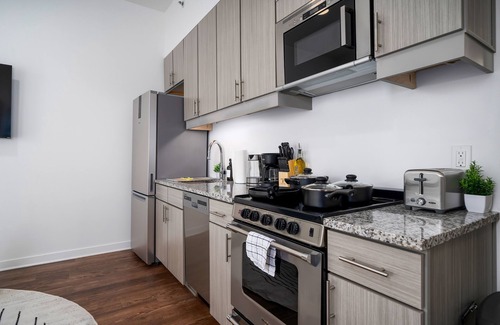 our goal is to provide a socially and environmentally conscious living environment, along with top-notch customer service and unparalleled amenities that are unmatched elsewhere The living space features high ceilings for a luxurious feel that blends with the kitchen, creating a modern and sleek living experience.