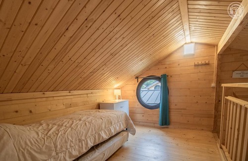Individual chalet. Access by a few steps. Ground floor: Living room-kitchen, separate toilet, bathroom (shower), 2 bedrooms (1 double bed 140x190 cm / 2 single beds 90x190 cm). 1st floor: mezzanine (2 single beds 90x190 cm), 1 bedroom (2 single beds 90x190 cm), separate WC. terrace. Accommodation under slope on the 1st floor. Collective barbecue in the campsite. Contemporary wooden chalet benefiting from a beautiful exposure 10 minutes from the Savière lock and the Rhône. Quality immediate environment. Beautiful shaded terrace. Private outdoor space in front of the chalet..