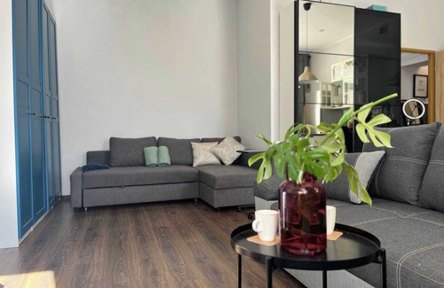 welcome to our comfortable and fully equipped apartment, perfect for a short getaway or a longer stay The living room offers everything you need for relaxation. A double sofa bed is the centerpiece. A coffee table and chest of drawers complete the space. The bedroom guarantees a good night's sleep thanks to its comfortable double bed. Guests have access to a spacious wardrobe, a bedside table, and a set of fresh linens. A functional desk with a chair is the perfect place for remote work. The kitchenette is equipped with all the necessary appliances for self-catering. You'll find a stove, oven, and a large refrigerator with a freezer. The bathroom features a modern shower, toilet, sink with mirror, and a practical cosmetics cabinet. A washer-dryer is extremely convenient. The apartment is pet-friendly and comes equipped with two beds, bowls, toys, a leash, and other accessories. Guests also have access to a shared balcony.