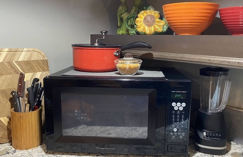 the coffee bar has both a big coffee pot and a keurig We anticipate that folks from your group will want to drink coffee and listen to the birds in the morning…sit on the deck or go up in the tree! We have a dozen wine glasses and a collection of Nostalgia Records for a relaxing evening indoors or out.