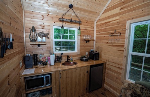 a long ramp leads you up to the entrance of the treehouse The view from the rocking chairs on the front porch are to die for, while enjoying your morning coffee or evening glass of wine. When entering the front door, to the left is the door that leads you to the bedroom with a queen size bed. Walking just a bit past the bedroom, the following left door is the full bathroom, which has a shower/tub combo. There is a small seating area to enjoy your company, watch some TV, or to read a book. The kitchenette area is on the far back wall. It has a Keurig coffee maker with coffee for your first morning. The kitchenette also has a microwave and electric skillet for cooking your sides for your grilled chicken or steak! Lastly, there is a small fridge to keep your food necessities and drinks cold during your stay.
