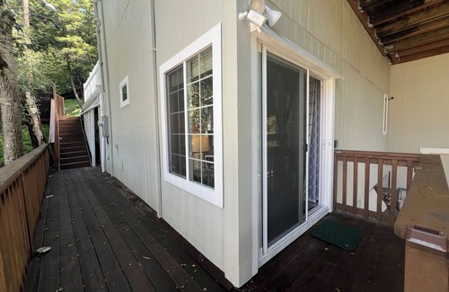 enjoy peaceful forest views and wake up to chirping birds on your private deck Unwind with a book, a drink, or movie on Roku TV.