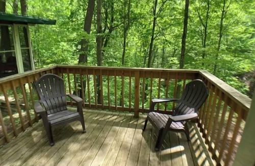 Experience Treetops cabin in the woods for your relaxing retreat. A one of a kind cabin overlooking a huge ravine and creek, surrounded by old growth forest. You can enjoy the views of the woods from every room and the huge deck. Relax to the sounds of nature with friends and family while comfortably lounging on the screened in porch. Plenty of space, privacy, and activities for the whole family on the property to enjoy.