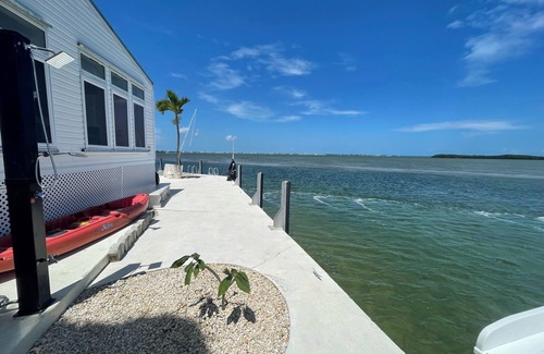 Don’t be fooled by canal front listings. Lose yourself in the ever changing beauty of the Atlantic Ocean in this charming, recently renovated 2 bedroom cottage with large living area and open floor plan. Bring your boat and keep it steps away from your back door on the 52 foot seawall. The cottage sleeps 6 with a king bedroom, twin over full bunk room and a queen size Murphy Bed in the living room for those who want to wake up with a beautiful sunrise view. There is a double kayak, paddle boards at the unit for those who want to explore the Venture and Out Keys that you can see from the living room. Floats, life jackets and a swim ladder and bikes are also onsite. After your ocean fun, rinse off in the solar shower located outside. There is a washer and dryer in the unit as well as coin laundry at the bathhouse which is a short walk away. Each bathhouse also has several showers for guest use. Venture Out Resort has a 24 hour security, large pool, hot tub, picnic tables, tennis courts, pickleball courts, playground, boat ramp and a marina store with fuel, groceries and tackle.
