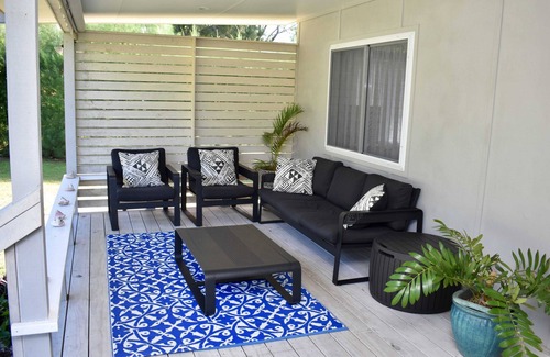 inside, the house is all about clean lines and comfort, a big spacious kitchen with a 900mm oven plus dishwasher the kitchen flows to the indoor dining area (which could be handy for 1000 piece jigsaw puzzles), and a cosy tv nook The master bedroom (queen bed), and the second bedroom (2 singles) come off the main living area, both bedrooms have air conditioning. Also off the main area is the laundry, with washing machine and dryer, and the roomy modern bathroon.