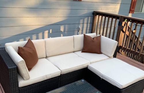 our back deck is a great place to hang out at and look at the stars on our cozy outdoor sectional, or enjoy the propane fire pit at the outdoor dining table Have a summer evening BBQ with the family using the charcoal grill. string lights are featured along the entire back deck to make the evenings even more magical :)