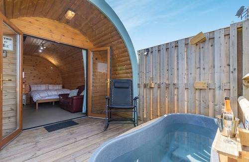 two hoots is a detached pod situated in flint, in the north-east of wales Hosting one double-bed bed in the open-plan living space, comprising of sitting area, kitchen area, and dining area, this property can sleep up to two people. There is also a separate bathroom including a shower cubicle, basin, WC and towel rail with some shelves for storage. There is off-road parking available, a private decked area with wood-fired hot tub set into the decking, and a shared lawned garden area with picnic benches. Further wood for the hot tub can be purchased locally. Two Hoots will give you a gorgeous back-drop of the North Wales countryside for your romantic break away. No smoking at property or on the grounds of the property.
