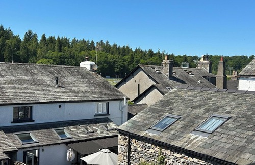 eat at the dining table inside, and observe the world around you as you gaze over the rooftops, and down onto our courtyard This stone walled yard is for your exclusive use, and has a garden sofa and chairs for al fresco dining, a bench seat, and there are cushions and more chairs in our stone store - again for your exclusive use. So if you fancy soaking up the sunshine after a day's walking; a read with a glass of wine, then this is the perfect spot. The en suite master bedroom with kingsize bed looks out towards the Priory. Just off the village square, and adjoining the famous arch, the apartment is seconds away from great pubs, just along the lane from the UK's top restaurant, three Michelin starred L'Enclume, and an array of village shops. You can BBQ in the courtyard - the property's enclosed English Garden patio is your's alone to enjoy. Yards away is the racecourse and footpaths over the Fell are just beyond. The apartment retains bags of character, with beamed ceilings (and walls and floors!),. It's beautifully kept, and has had new kitchen, bathrooms, and refurbed bedrooms all in the last four years. Bed1 had new handbuilt furniture made and installed during summer '20. There's unlimited WiFi; flat screen TVs, with all catch up services on living room smart TV, and Alexa in there too! Integral DVD player in Bed1, and an Echo dot. Outside in the yard, as mentioned, is our store house to accommodate your bikes/outdoor paraphernalia. Well behaved dogs welcome by arrangement.
