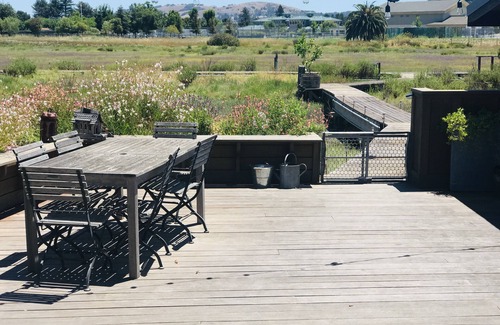 This wood paneled home has a Japanese-style peaked roof, windows and doors to the creek and marsh outside, a large view deck, 1 bedroom and bathroom with double shower, and is only two blocks to Larkspur’s famous restaurants, shops, theater, grocery store and gas station. Living, dining, kitchen have tv, fireplace, Thermador professional range. This is a home; everything you need is here. 7 miles from Golden Gate Bridge and San Francisco. An hour north to wine country. Ocean beaches 20 minutes..