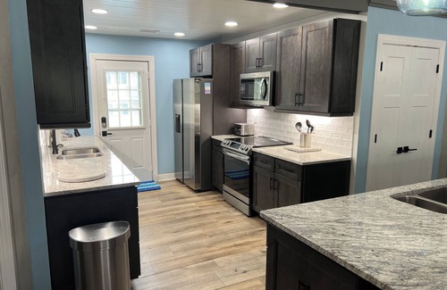 ~this cottage has an equipped kitchen which is being renovated prior to 2024 rental season with new cabinets and appliances the kitchen made larger and will allow for a large cooking and prep area to accompany the new island A six (6) person table is available in the Carolina Room for additional eating areas. A new island has been installed with a secondary sink and four (4) sitting areas for hanging out and eating. Also, a large picnic table is located below the house for use with the gas grill.