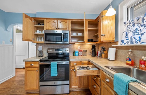 feel at home and whip up your favorite meals in our fully stocked kitchen! whether it's breakfast, lunch, or dinner, you'll have everything you need, from gadgets to utensils We've got a full-size fridge/freezer, a gas cooktop and oven, a microwave, a coffee maker, and a dishwasher to make your stay as convenient as possible.