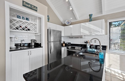 make yourself at home in the comfortable family room with soaring ceilings and plenty of seating for everyone, you will be greeted with a spectacular wall of windows in the living area that frame the natural beauty of seabrook Enjoy watching the television after a long, hot day or stream your favorites with the free WiFi included. The fully equipped, tastefully updated kitchen enables everyone to enjoy meals together. There is even a small coffee bar area with a prep sink. The dining table is framed by windows and is also great for board games/cards after a busy day of fun in the sun.